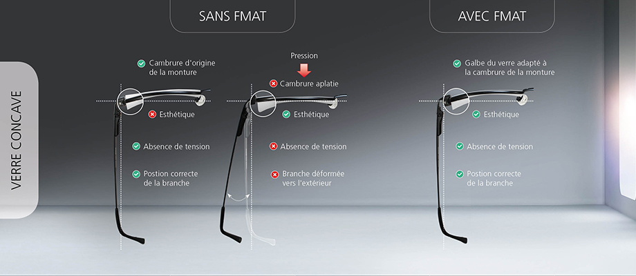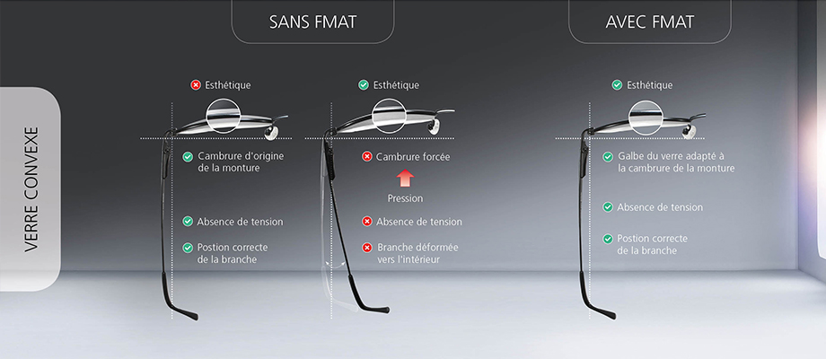 La technologie FMAT permet de faire varier la courbure de base du be 4ty+ HDQ (dans la limite de +/- 1.00 dpt) afin de mettre en adéquation le galbe du verre avec la cambrure de la monture choisie, tout en conservant les performances du design. La technologie QUBE recalcule alors le design en fonction de la courbure de base choisie. A défaut de données spécifiques, la courbure de base est celle définie par la technologie QUBE.